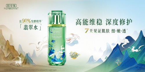 佰草集翡翠水敦煌限量版以“修复敦煌经典”为概念,设计主体采用敦煌壁画中的石青色,描绘了九色鹿和飞天仙女等经典形象,辅以山峦、溪水,一幅悠然自得的敦煌仙境呼之欲出,在概念上佰草集翡翠水就充分运用了浪漫写意画风,将中国经典灵活运用于现代设计中。