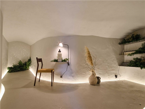 第二个空间是介绍然作代表系列“整株”原材料的空间。然作的独家成分"(Whole Plant Effect)"使用了在韩国生长的酵参根、沉香茎、栀子花等, 顾客可以自由触摸和体验这几个原材料。接着在神秘的房间“洞穴”中,不仅是视觉和嗅觉,还可以通过和韩国人气音乐达人合作而制作的播放列表,通过听觉等所有感觉来体验”整株”系列。