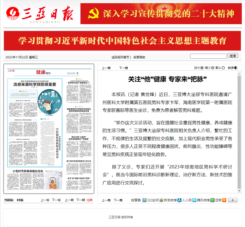 三亚博大泌尿专科医院邀请广州医科大学附属第五医院男科专家卞军、海南医学院第一附属医院专家欧善际等医生坐诊,免费为患者解答男科难题。