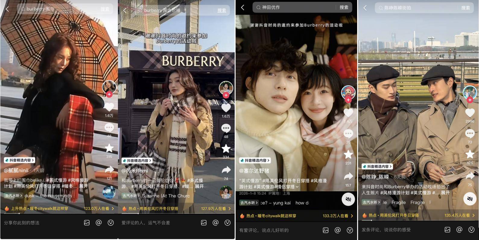 近期,抖音时尚发起「风格漫游计划」,聚焦城市通勤、校园生活、户外出行三大高频场景,通过 #都市游猎风、#英伦学院风、#假日漫游风 ,邀请创作者与用户共同探索穿搭与生活场景的深度结合。与此同时,抖音时尚也与BURBERRY展开以「英式慢游」为主题的线上线下联动,在2026年开端,让风格不止于观看,更成为可参与、可体验的生活内容。