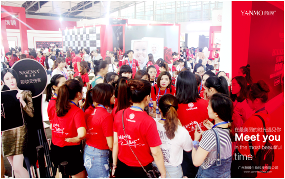 9月2日,颜膜又有大动作,5款新品同日首发,这一聚睛之举,也可视为美博会前夕的热身和造势。9月3日开幕的美博会,颜膜不但以600平方创下馆王记录,而且成为每天唯一爆满的展馆。