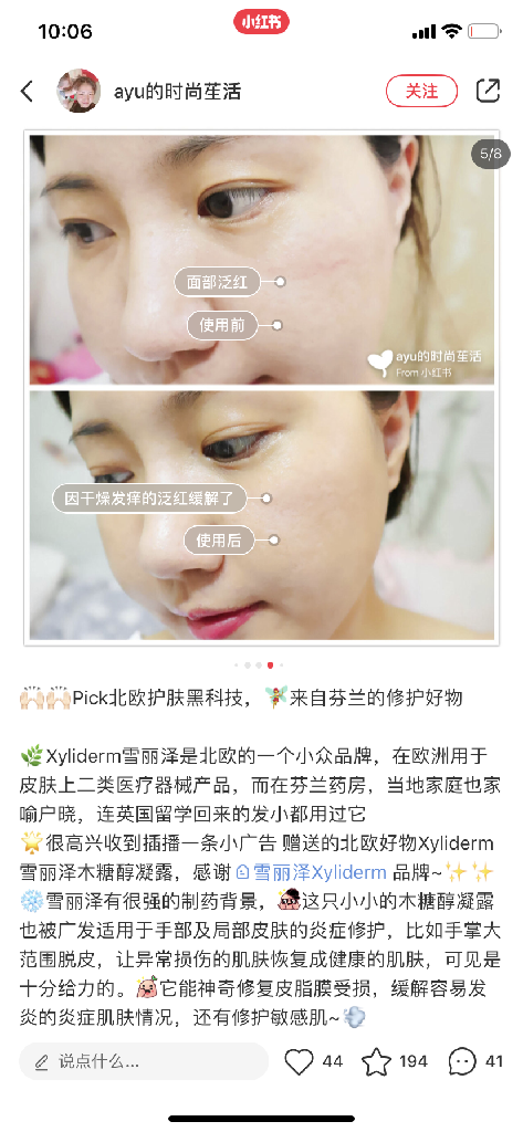 小红书上很多护肤达人在使用雪丽泽凝霜后,红皮效果改善明显。Xyliderm 雪丽泽旨在治疗干燥、脱皮、刺激性和湿疹皮肤,能够有效缓解皮肤红肿、脱皮、发红和瘙痒,特别适用于患 有遗传性过敏症、牛皮癣、痤疮和湿疹的人群。