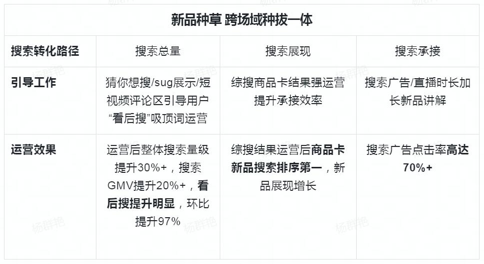 爆发期搜索SEO:此次活动,巴黎欧莱雅通过抖音达播场次切片进行搜索引导,以及通过海量种草短视频提升搜索量级的同时在评论区引导用户进行“看后搜”,同时综搜商品卡结果强运营提升承接效率,最后通过搜索品牌专区定向引导用户进入直播间,将新品讲解时长拉长以承接流量并提升转化效率。运营后,巴黎欧莱雅整体搜索量级提升30%+,商品卡新品搜索排序第一。